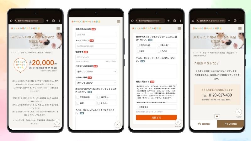 WEB相談の場合、スマホやPCから赤ちゃんの頭のかたち相談室にアクセスします。画面をスクロールして保護者の氏名、連絡先、子どもの月齢、相談内容などを記載するフォームへ入力していきましょう。