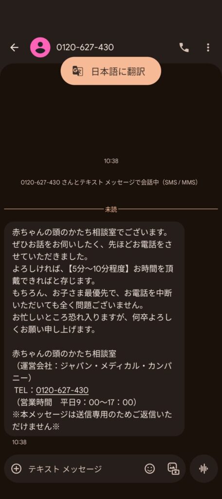 夜にWEB相談申込みしたところ、翌日に電話がきました。着信時、おむつ替え中で出れませんでしたが、その後SMSで連絡があり、フリーダイヤルに折り返しました。